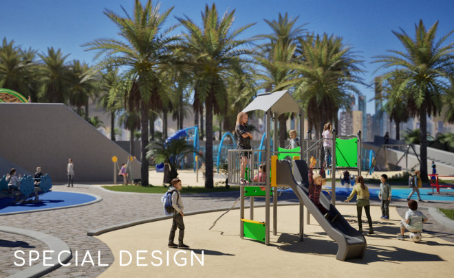 Η κατασκευή αποτελείται από ανοξείδωτο ατσάλι, ατσάλι με επίστρωση πούδρας, αλυσίδα ανοξείδωτου ατσαλιού, HDPE, πολυκαρβονικό (PC), καουτσούκ και αντιολισθητικό HPL, εξασφαλίζοντας ανθεκτικότητα και υψηλή ποιότητα που αντέχει στις καιρικές συνθήκες και την έντονη χρήση.